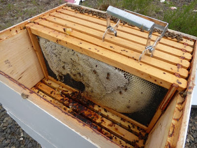 ...but the beekeeper said if we had any frames with existing comb, it was better to use those since it would save the new bees some work. Existing comb would provide abundant places for the queen to lay without having to wait for the bees to draw out fresh comb. It's the ultimate in recycling; I love it.