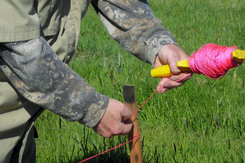 Because the pasture is sloped (everything on our property is sloped!), we hammered a stake just where the line of vision breaks between one end of the fence line and the other. Then we used the bright-pink string to mark the fence line.